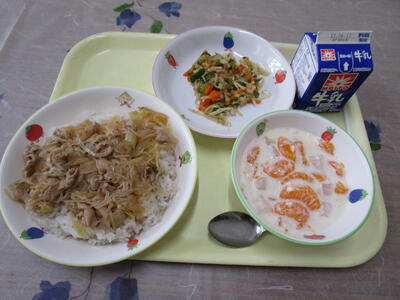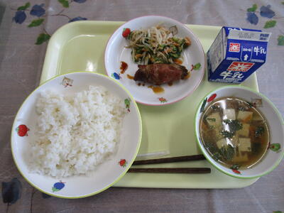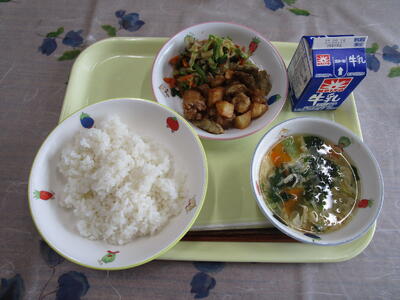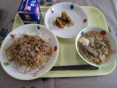 今日は少し暑いですね。新しい教室の生活はなれてきましたか?少し疲れたなと思っている人はいるでしょうか。豚肉には、皆さんの体をつくるもとになるたんぱく質が多く含まれています。また、ほかの肉に比べて疲れた体を元気にしてくれるビタミンB1がたっぷり含まれています。今日もしっかり食べて元気に過ごしてくださいね!