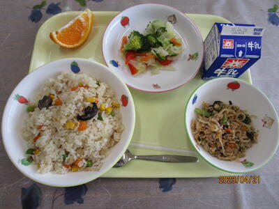 牛乳 コーンピラフ フレンチサラダ しらたきソテー デコポン
