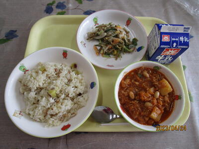 牛乳 さつまいもとハムのピラフ チリ・コン・カーン ごぼうサラダ