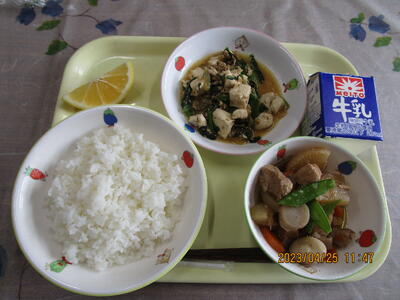 今日のご飯に入っている筍と、すまし汁のウドは、春に採れる「山菜」の一つです。山菜には、春に芽吹いた新しい芽の部分を食べます。山菜には、独特なかおりやにがみ(えぐみ)がありますが、これらは冬の間に眠っていた体を目覚めさせる効果があります。山菜は今の時期しか採れない食べ物です。ぜひ、春の味を楽しんでくださいね。