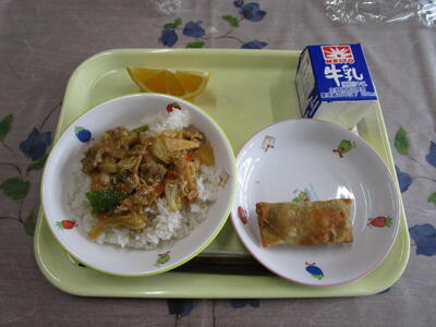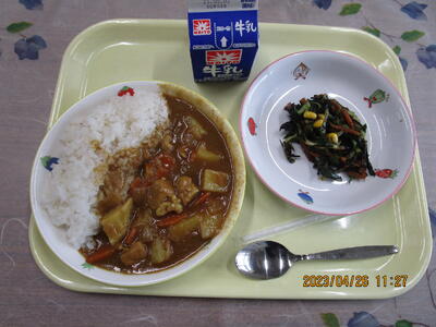 今日の給食のメニューは人気献立の一つであるカレーライスです。カレーにも様々な種類がありますが、今日は豚肉を使ったポークカレーです。「カレー」はインドの料理というイメージがありますが「カレーライス」は、日本人によって作られた料理です。給食のカレーは、玉ねぎをじっくりと炒めて、おいしくなるように工夫しています。