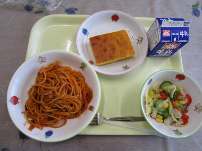 牛乳 ナポリタン コーンサラダ チーズと豆のケーキ