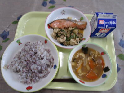 牛乳 ゆかりご飯 サケの生姜焼き 豆腐と青菜のごまみそ炒め 根菜の味噌汁