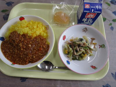 牛乳 サフランライス ドライカレー キャベツのソテー 冷凍リンゴ