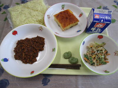 牛乳 和風スパゲッティ 豚肉と豆腐のオイスター炒め おから抹茶ケーキ