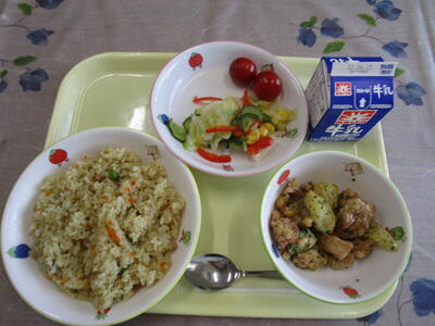 牛乳 メキシカンライス チキンとポテトののり塩揚げ コーンサラダ ミニトマト(2個)