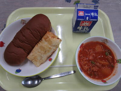 牛乳 黒糖パン トマトシチュー 豆とツナのパイ