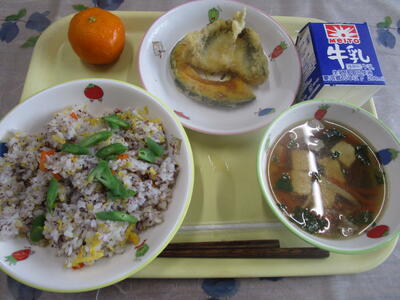 牛乳 あじさいごはん 天ぷら(あじ・かぼちゃ) さわに椀 冷凍みかん