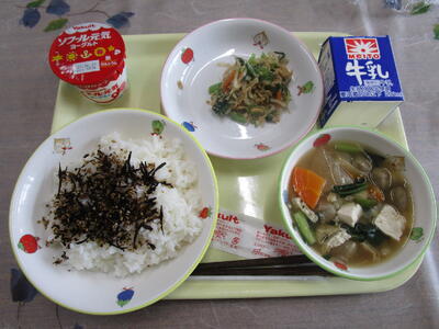 牛乳 ご飯 ひじきのふりかけ つみれ汁 ツナ和え ヨーグルト