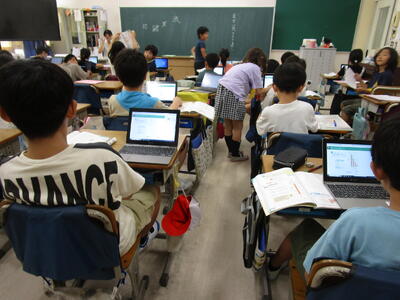 3年生、3組の先生が4組で理科の学習を進め、4組の先生が3組で社会を進めていました。どちらの授業も、画像を使いわかりやすい授業でした。