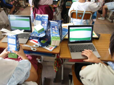 4年生、図工の学習で、教科書のQRコードをタブレットで読み取ると、牛乳パックをつかった動くおもちゃの作り方が出てきます。6種類ある中から自分の作りたいものを選んで、作り方を参考にして、工夫して作っていました。