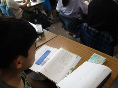 台風の影響が心配されましたが、今日はとてもいいお天気になりました。教室で、子供たちは、宿題を集めたり、夏休みビンゴや夏休みの話をしたりしていました。黒板には、担任の先生からのメッセージが書かれていました。そんな中、6年生は、9月5日(木)6日(金)の修学旅行に備えて、今日からしおり作りをしていました。どの学年の子供たちも元気いっぱいでした。