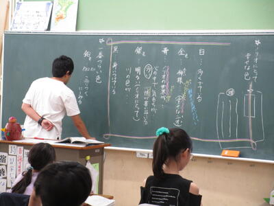 6年生、国語「川とノリオ」の学習では、作品に出てくる色に着目して授業が進んでいました。「ノリオにとって幸せな色は・・・。一番つらい色は・・・。」子供たちは黒、白など自分が選んだ色とともにその色を撰んだ理由も発表していました。