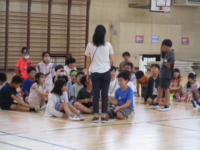 体育館で、全校児童が集まって夏休みを迎える会を行いました。校歌の場面では、高学年がアルトを歌い、全校で美しいハーモニーとなりました。その後、校長先生からは、七夕クイズの後に、願い事をかなえるために、自分を振り返り、夏休みや9月から目標をたてて行動しようという話がありました。その後、生徒指導の先生と代表委員の児童から夏休みの生活についての注意点について話がありました。最後に表彰児童が、全校に紹介され、皆から拍手を受けました。
