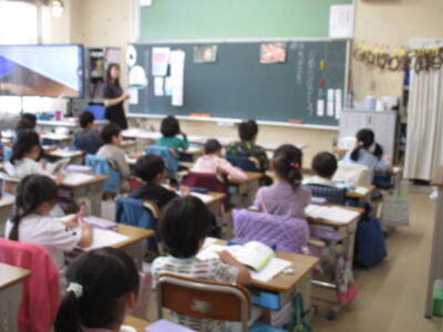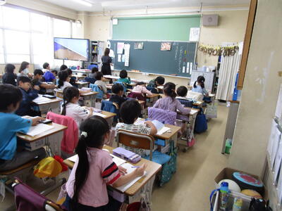 3年生、少人数教室と教室の2か所に分かれて、あまりのある割り算の学習をしていました。4年生は、外国語活動で、何時に何をするを英語で話す学習をしていました。ゲーム的な要素を入れながら、楽しく学習していました。