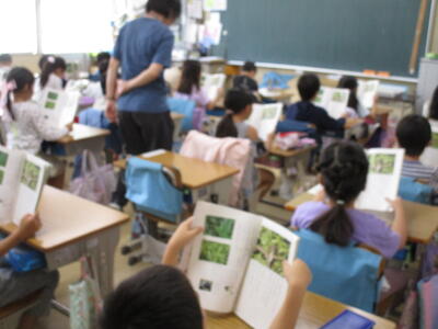 1年生、絵日記で書いた文章を見直す学習をしていました。「自分の文章を書き終わったら、声に出して読んでみましょう。声に出してみると、ぬけている言葉や間違っている言葉に気がつくので、直しましょう」と先生がいうと、子供たちも自分の文章を声に出して読んでいました。隣のクラスでは、アサガオの花が咲いたカードが教室に掲示されていました。花の様子が絵や文で上手に表現できていました。