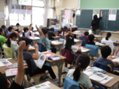 5年生、実習生の先生が算数で分数の大きさを比べる授業をやっていました。最初の問いに子供たち、とても積極的に手をあげています。