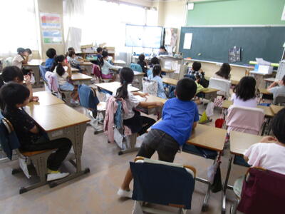 5年生、夏の思い出をタブレットで写真や地図などを示しながら発表していました。長野や沖縄など、いろいろなところに出かけた話が多かったです。ネイチャースクールの時に、雨で行けなかった沖ノ島に行った発表をした子もいて、ほかの子たちからは「いいなぁ」と声があがっていました。