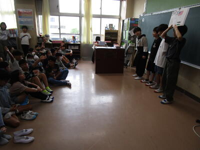 5年生が総合的な学習で千葉県のことを調べ、朝学習の時間を使って、3年生に発表していました。説明キャラクターをペープサートにしたり、クイズを出したりしながら、千葉県の地形や農産物などについて、楽しくわかりやすく伝えていました。