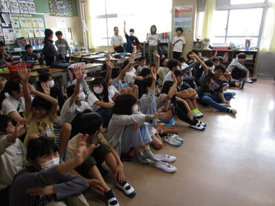 朝自習の時間に、金曜日に行われる陸上大会の壮行会が放送で行われました。その放送の前に、代表委員が中心となり、陸上部へのエールを手拍子と掛け声の練習を低学年の教室で行いました。1年生や2年生も、練習をしたので、大きな声で応援エールを送ることができました。