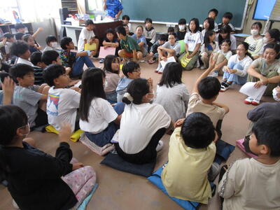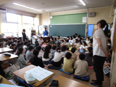 業間休みには、のびのびできらきら星さんによる、1.2年生の児童への読み聞かせがありました。とても楽しいお話だったので、子供たち笑顔で聞いていました。