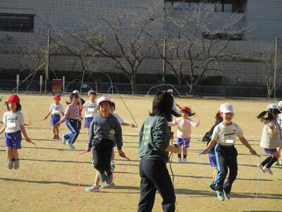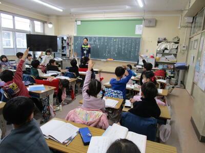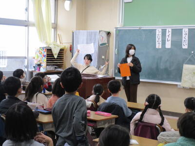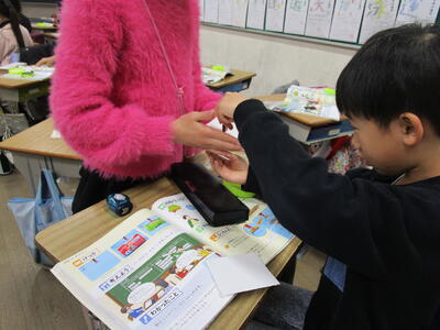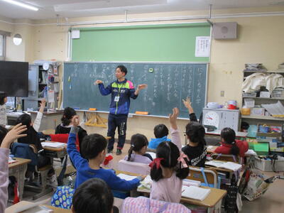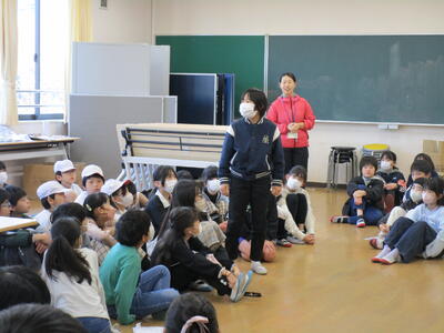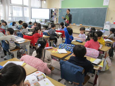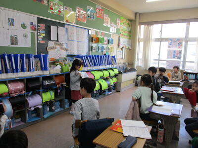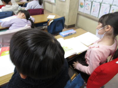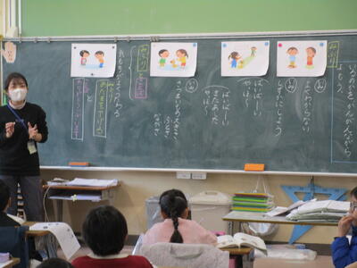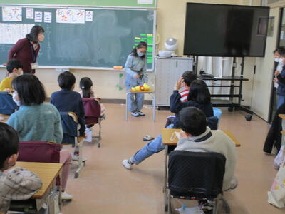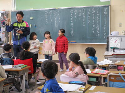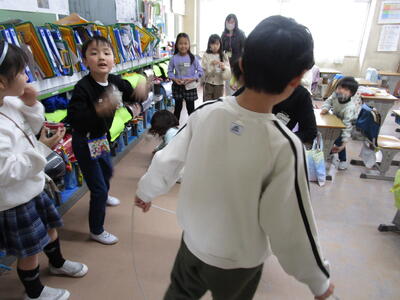 1年生、体育の縄跳びで前跳びや後ろ跳びを連続30回跳ぶのを目標に練習していました。前跳びは、できる子が多かったですが、後ろ跳びは、まだまだ難しそうでした。国語「みぶりでつたえる」で、相手に伝えたいことは、身振りと言葉で伝えると、しっかり伝わりやすいということを学びました。