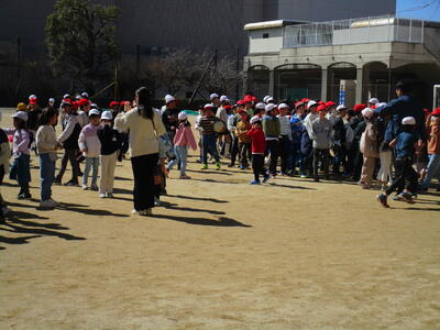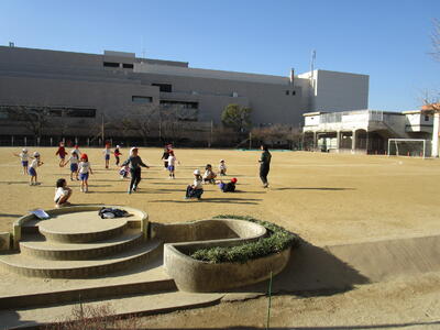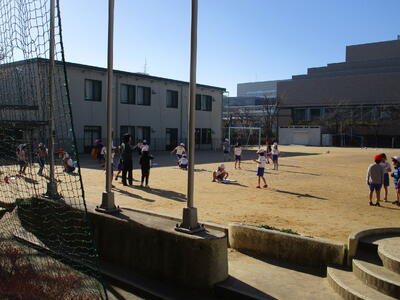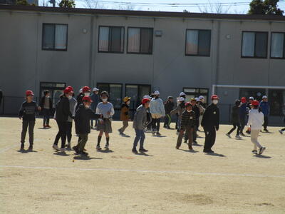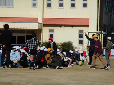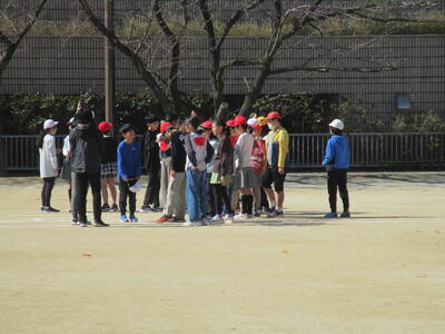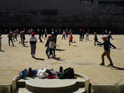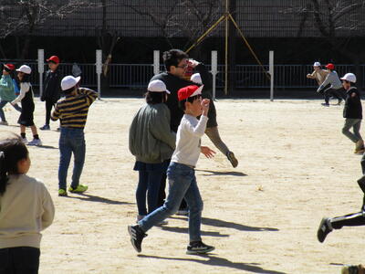 2年生と4年生。学級活動の時間を使い、交流会をやりました。30人ずつくらいのグループにわかれて、4年生が考えた遊びを2年生と一緒にやりました。「おにごっこ」や「ケイドロ」「だるまさんが転んだ」など、とても楽しそうに仲良くすごしていました。