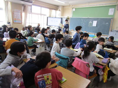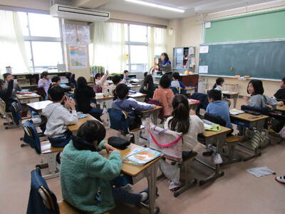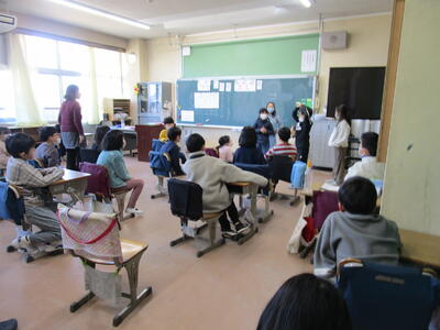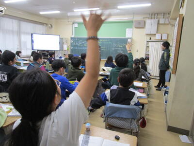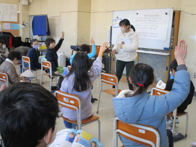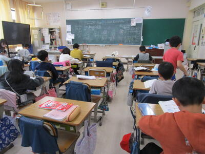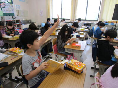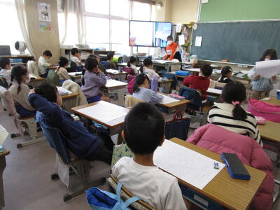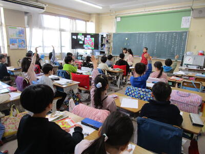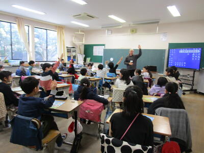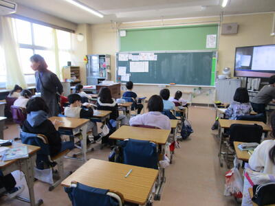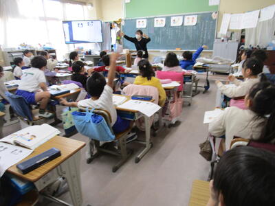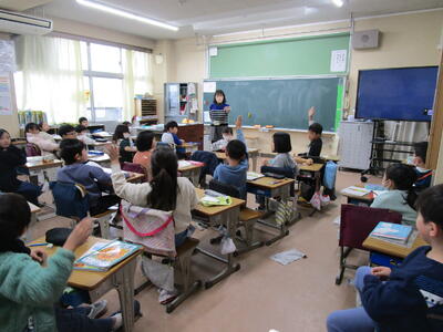 3年生、ALTの先生が来校して、英語で自己紹介をしたり、皆に今日の様子を聞いていました。まだ、2時間目なのに、「おなかがすいている人?」と英語で質問をされると、たくさんの子が手をあげていました。