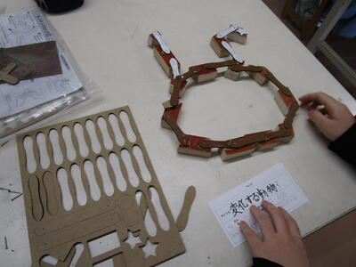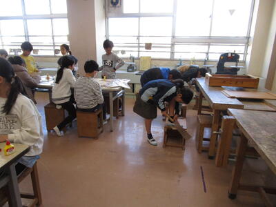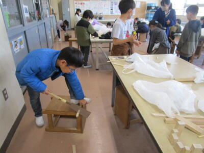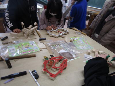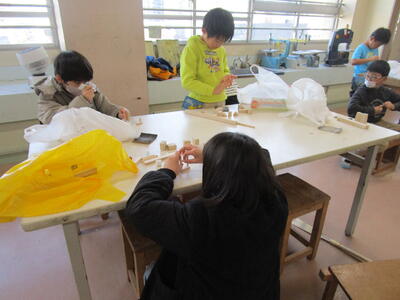 4年生、図工の金槌の使い方や釘打ちの学習です。釘を打って、動くものを作っています。耳の部分を動かすと、ウサギになったり、犬になったり・・・。子供の想像力は本当に豊かで驚きました。