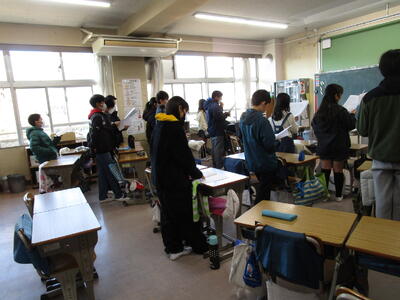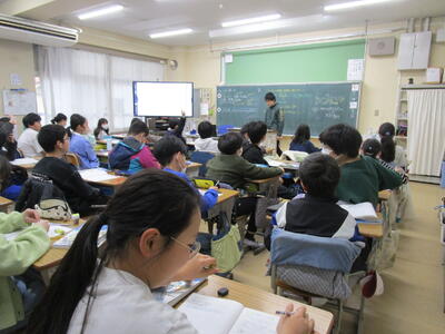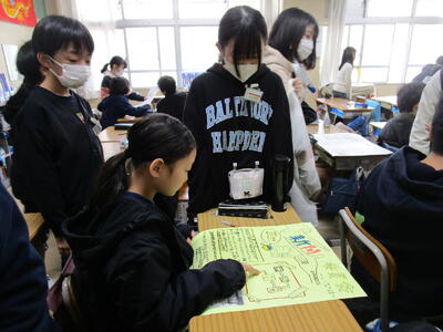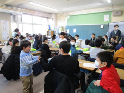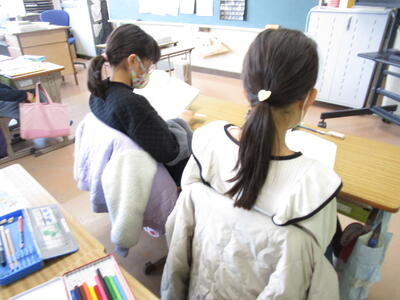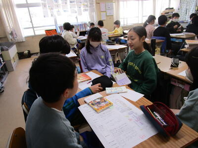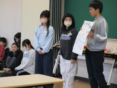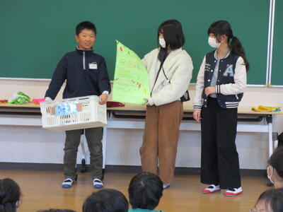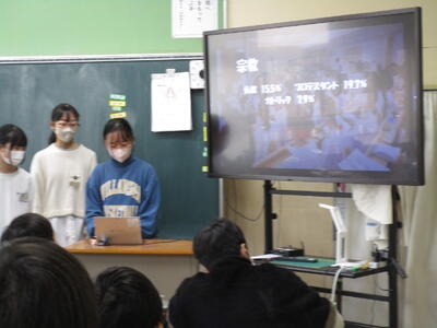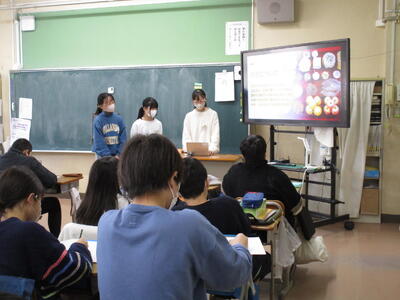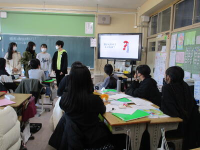 6年生、3月の給食の献立に、各クラスおすすめの献立が使われます。栄養教諭の先生が、各クラスで献立について授業をした後に、実際にグループで考えた献立に助言をしました。最後に、クラスの中で、各グループ献立を、パワーポイントを使っておすすめポイントをプレゼンしていました。ショウガを使った「体ぽかぽか献立」や「〇〇先生愛情たっぷり献立」など内容や献立名もとても工夫されていました。どんな献立になるのか、楽しみです。
