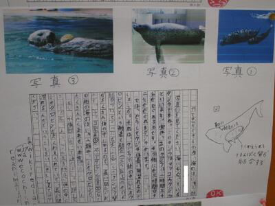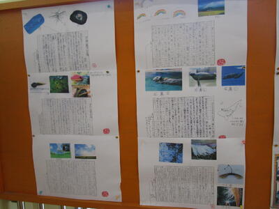 4年生、掲示板に不思議図鑑が掲示されていました。「生き物の寿命の秘密」や「海の哺乳類が息ができる秘密」「種をとばす植物について」など、写真と文章で分かりやすく表現されていました。