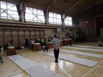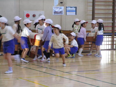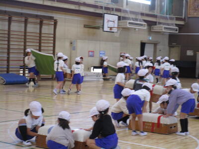 1年生、2クラス合同で体育館体育でした。先生の話をよく聞いて、跳び箱やマットを張り切って運んでいます。授業の準備もとても速くできるようになりました。