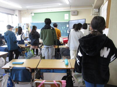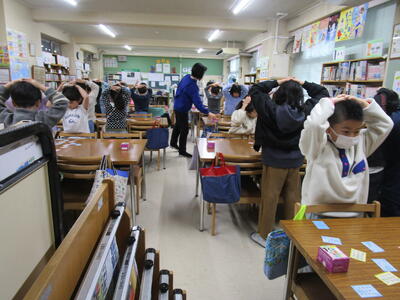 今日は、市川市では、「防災教育の日」です。朝から自分の身を守るためのシェイクアウト訓練をしました。その後、教頭先生から教育長のメッセージを代読し、校長先生の話があり、話の終わりには、全校で黙祷をしました。