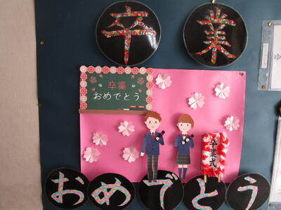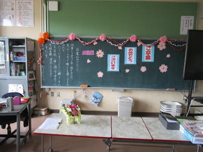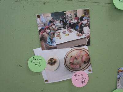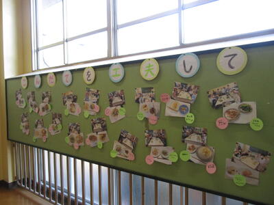 6年生、朝の時間に歌声が廊下に聞こえてきました。卒業式で歌う歌の練習が始まったようです。黒板には、「卒業まであと30日」「一日一日を大切にしよう」と書いてありました。歌声を聞きながら、あと30日で卒業と思うと寂しい気持ちになりました。6年生の掲示板には、家庭科で工夫して班ごとに作った献立が掲示されていました。「野菜のベーコン巻き・きゅうりのやみつきサラダ」など、どの班の献立もとてもおいしそうでした。