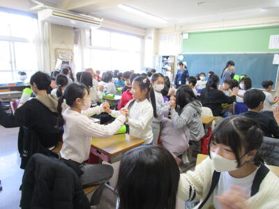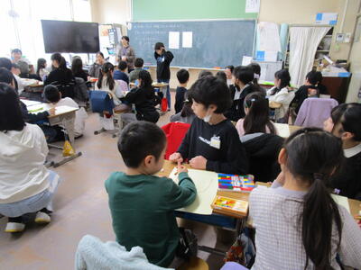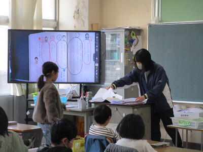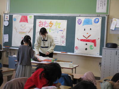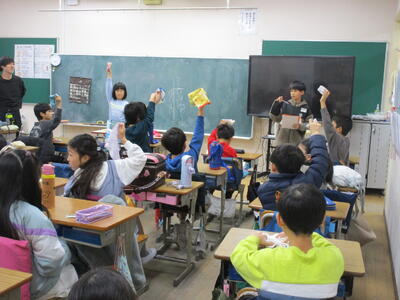 2年生、お楽しみ会でジェスチャーゲームをやっていました。担任の先生の日ごろの授業の様子をジェスチャーで表現したり、お医者さんの様子を身振り手振りで表したりして、見ている子供たちがあてていました。