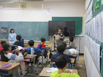 3年生、朝の会で日直2名がスピーチをしていました。皆の前で話すのは緊張すると思いますが、堂々と何も見ないで1分ほどのスピーチをしていました。スピーチが終わると、聞いていた人たちから質問がでていました。