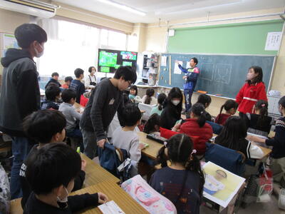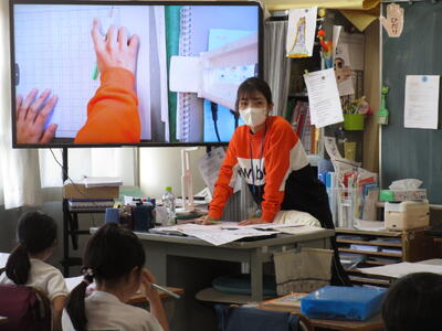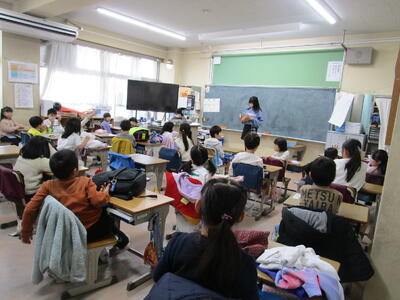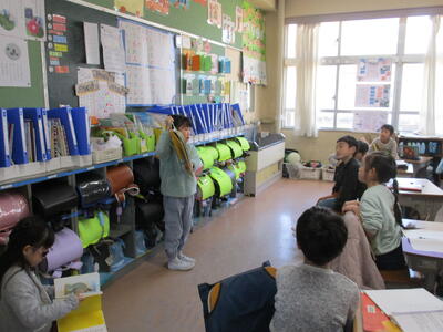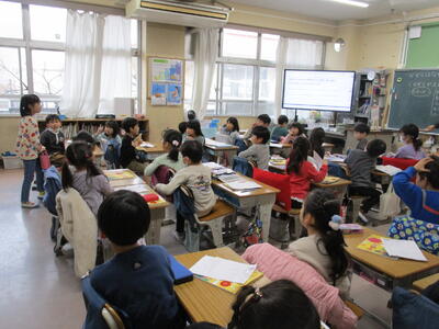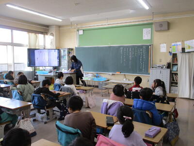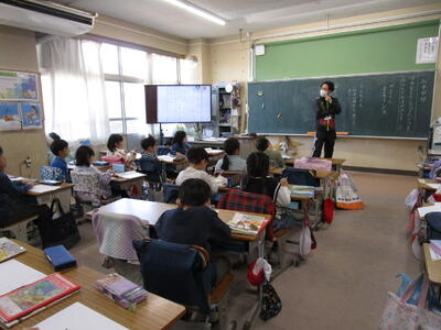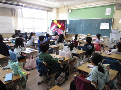 5年生、英語専科の先生が、ABCルームで授業をしていました。初めての授業なので、挨拶の仕方や自己紹介の仕方を英語で確認しています。英語の先生は、料理がするのが得意なことやウーパールーパーをペットとして飼っていることを英語で画像を使ってわかりやすく紹介してくれました。また、例をあげて「英語はリズムが大切です。今年1年、リズムを意識して学習していきましょう」とお話しされ、子供たちもとてもよく聞いていました。
