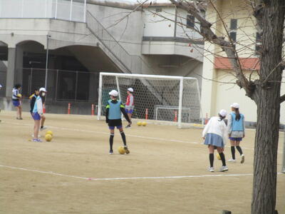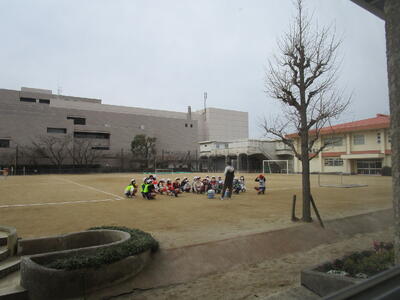 6年生、体育の時間に、校庭でサッカーをしていました。今日は、冷え込んでいて八時半ごろには小雪がちらつき寒かったのですが、試合の前に、一人一つのボールをタッチしたりドリブルをしたりした後に、二人でパス練習をしていました。試合の前に体も温まり、トレーナーを脱ぎ、半そでになる子もいました。元気ですごい!