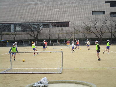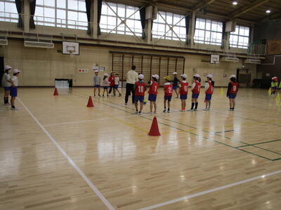 5年生、体育館でサッカーの練習です。雨の日も寒い日も、子供たちは元気いっぱいです。