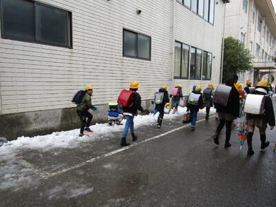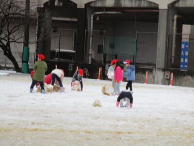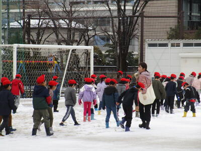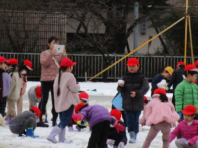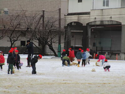 1年生は、生活科「ゆきやこおりとなかよし」という単元があり、昨日、学年メールで着替え等の持参を急にお願いしました。ご協力ありがとうございました。雪はシャーベット状で、あまりいい状態ではなかったですが、1時間目から1学年全員で校庭に出て、雪を踏みしめたり、触ったり、雪だるまやの雪の塊を作ったりしました。子どもたちが教室に戻った後は、たくさんの雪の塊が校庭に残っていました。子どもたちも楽しんで雪体験ができたようです。子どもたちのパワーを改めて感じました。