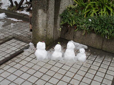 昨日からの降雪で、朝も路上には雪があり、子どもたちは、テンションが高かったです。歩きやすいように雪をかいたのに、わざわざ雪の上を歩く子どもも多かったです。雪かきついでに作った4体の家族雪だるまにも多くの子どもたちが「かわいい」と喜んでくれました。