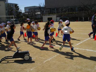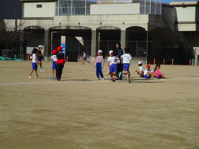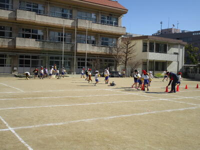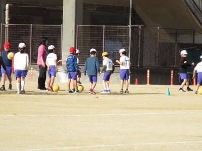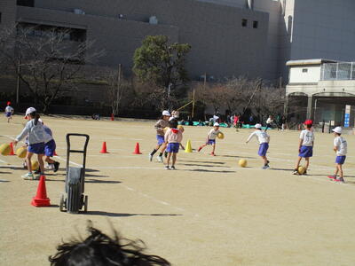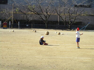 1年生、風が強い中、体育でマラソンをしたり、ボールけりをしたりしていました。ボールを少し離れたコーンにあてるように皆頑張っていました。