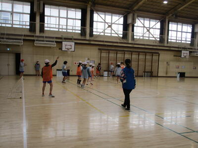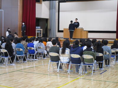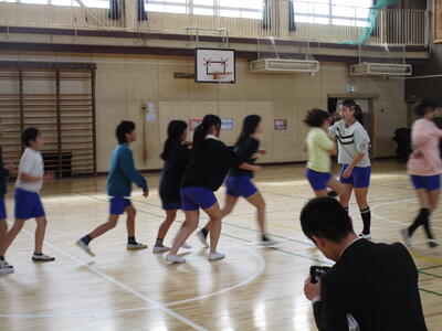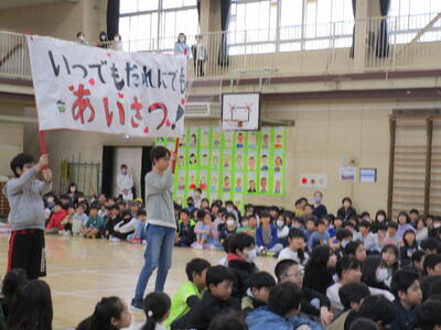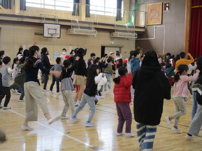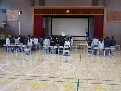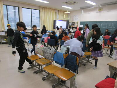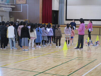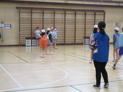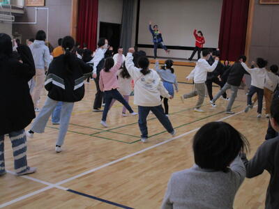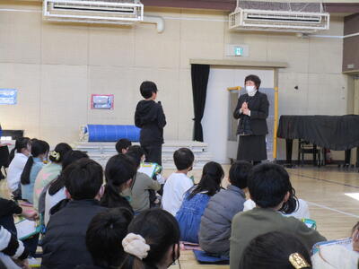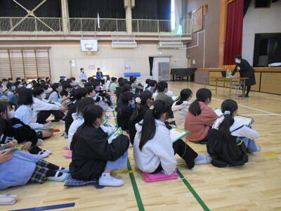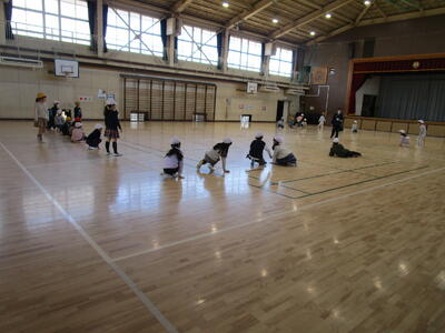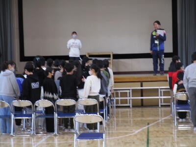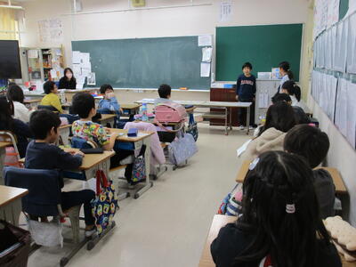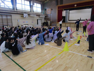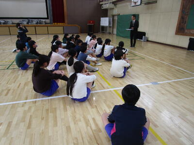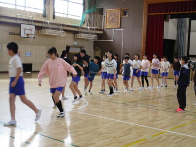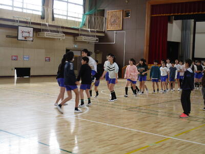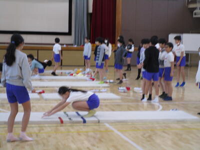 2年生、体育館で体育の授業が始まると、先生が準備をしていても体育係さんが中心となり掛け声をかけて準備運動を始めていました。別のクラスでは、今週の金曜日に行われる「1年生を迎える会」の練習をしていました。