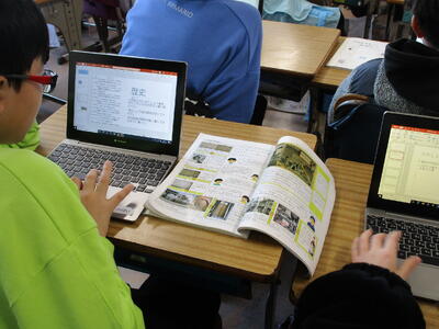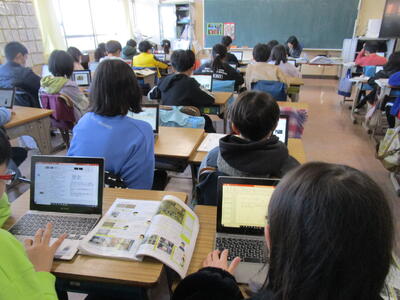 4年生、一人一台端末を使って、社会のしょうゆづくりで大切なことをパワーポイントでまとめていました。「わたしたちの市川」から写真を張り付けたり、文を引用したりしながら、工夫して作っていました。また、隣のクラスでは、一人一台端末を使い、国語の「便利ということ」についての自分の考えを入力し、前の画面で友達の意見を共有していました。