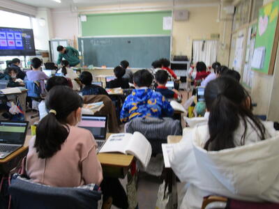 5年生、国語の「図書すいせん会をしよう」で5.6年生に本を推薦するために帯を作る学習です。帯にどんな工夫があるか、クラスで意見を交流していました。隣のクラスでは、算数の「円と多角形」の学習で、「どうしたらプログラミングで正多角形をかくことができるだろうか」を課題にして、一人一台端末で、取り組みました。プログラミングでの入力方法はむずかしいけれど、それがわかれば、様々な多角形がかけてとても便利だということを子供たちも実感したようです。