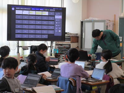 4年生、社会で都道府県を覚えるのに一人ずつ端末を使って「都道府県かるた」をやっていました。画面上左上にに読み札が1枚出てきて、数枚表示されたとり札をとります。「世界にとびたつ成田空港」という読み札がでた子供は、うれしそうに「千葉県が出た」と話していました。子供たちとても楽しそうでした。