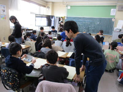 4年生、総合的な学習で「情報技術」について、講師の先生をお招きして、体験学習を行いました。3時間目は実際にCG技術、ドローン撮影など、最新の情報技術に触れ、4時間目は最新技術を活用した映像から情報リテラシーを学びました。児童は、興味深く学んでいました。