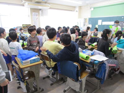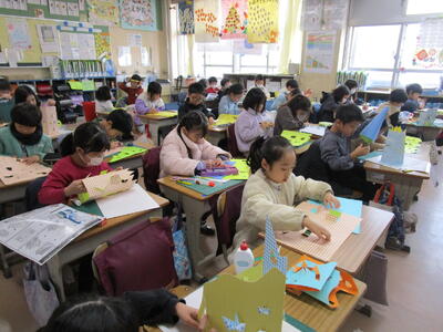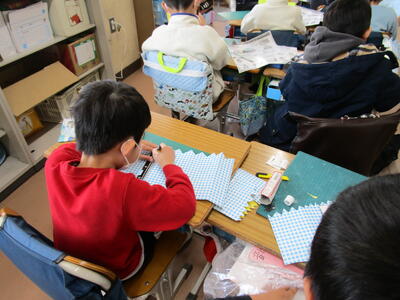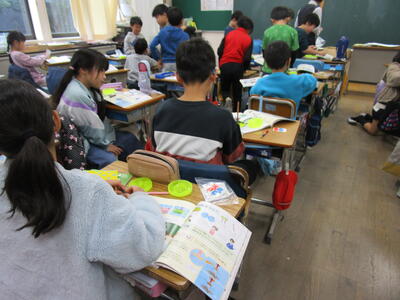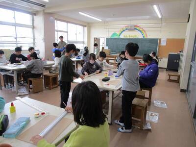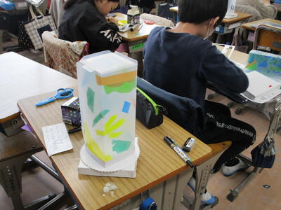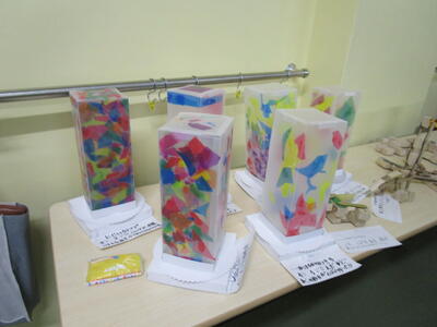 4年生、図工で「すてきな明かり」を作っていました。プラスチックダンボールにセロハンを張り付けていました。とても、カラフルに仕上がっていたので、中からライトで照らしたら、さらに素敵な作品になることでしょう。
