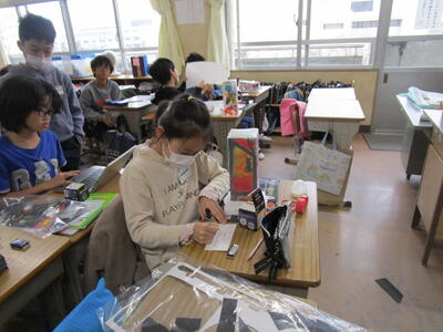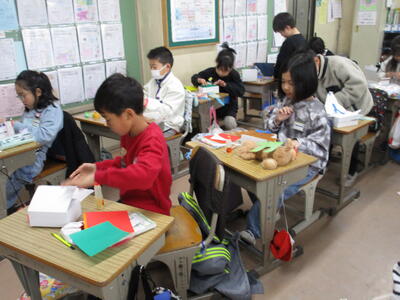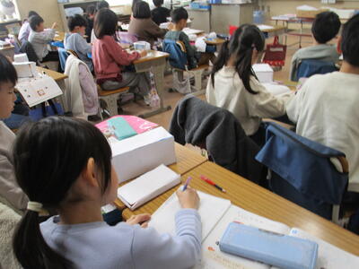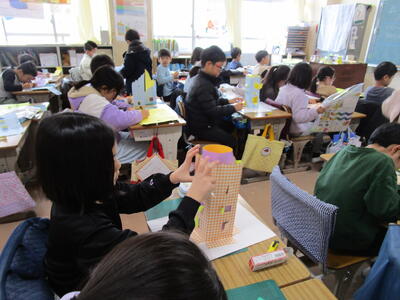 2年生、図工で「うきうきボックス」を作っていました。箱を切ったり、カラフルな紙を張り付けたりして、「くま」や「恐竜」「パンダ」など自分の好きな箱を作っていました。