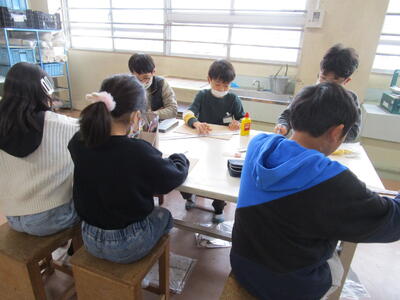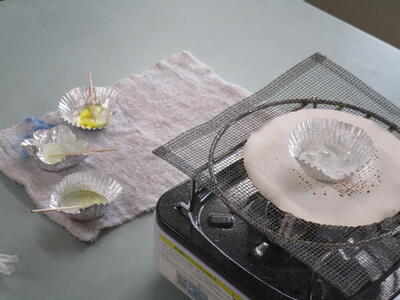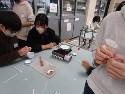 また、理科室では、別のクラスが「べっこう飴づくり」をしていました。火にかけてちょうどいい頃合いでとるのが難しく、「私のはまだ白かった」「焦げてしまったなど」・・・。とても楽しく活動していました。